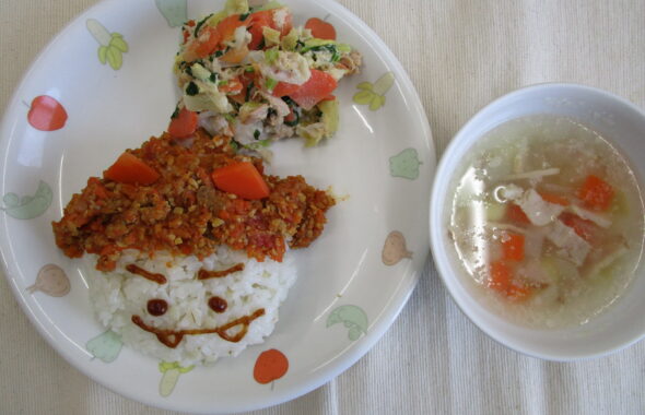 ピーマン・オクラ・レンコンなどを使って野菜スタンプ遊びをしました。オクラは星の形になったり、ピーマンや蓮根はお花の形になり、興味を持ち押していた子ども達です。野菜と触れ合うことで「食」への感心が高まる活動となりました。