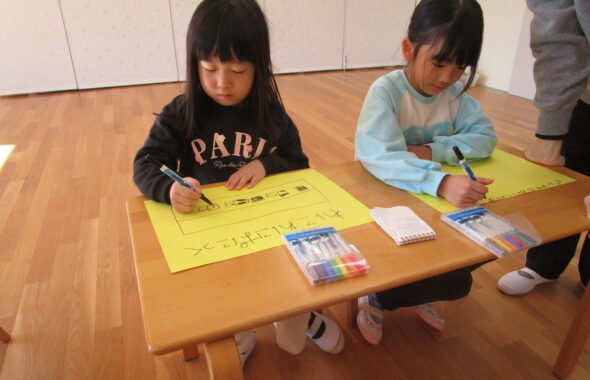 3歳児クラスでは、ぞう組さんのお友達と一緒にはじき絵をして水族館を作りました。