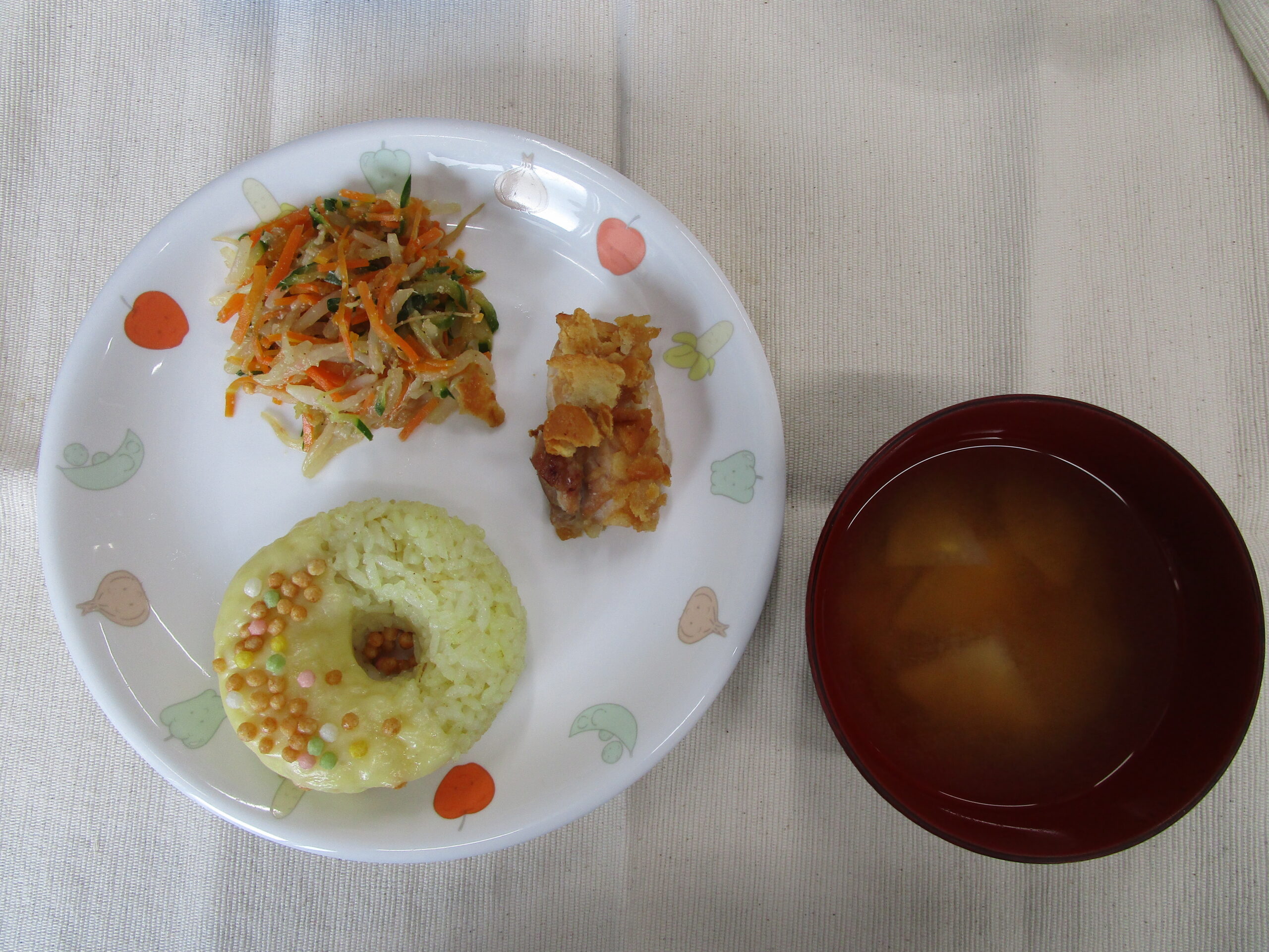 ドーナツおにぎり・鶏肉のクラッカー焼き・もやしの胡麻和え・味噌汁