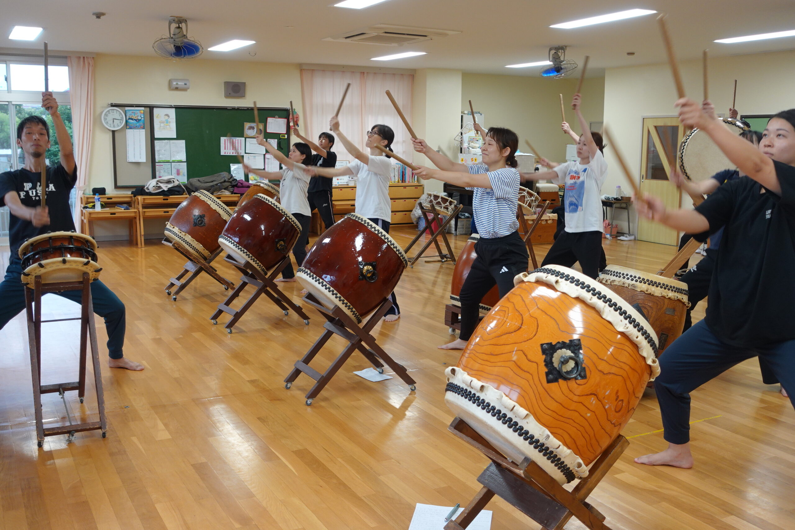 毎年恒例、多摩っこ座さんの指導で運動会に向けて職員も太鼓の練習に励んでいます。