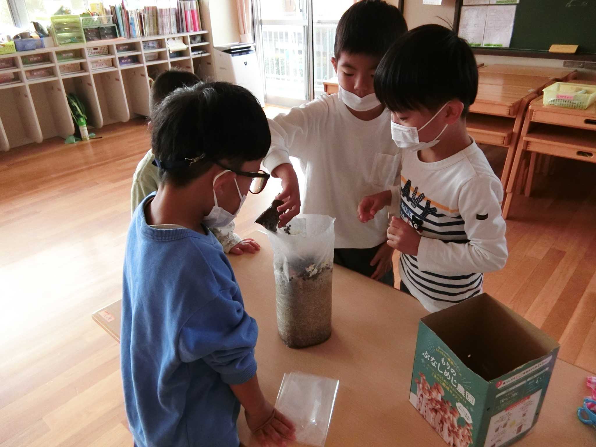 『しめじ』は初めて栽培するので期待いっぱい!栄養士の先生の話をよく聞いて、1つ1つ確認しながら取り組んでいた子ども達です。自分たちで説明書を読みながら、「湿らせすぎてはいけない!」など言いながら楽しんでいましたよ!「しめじが育ったら、どんな料理にして食べようか?」と収穫が待ち遠しいようです!