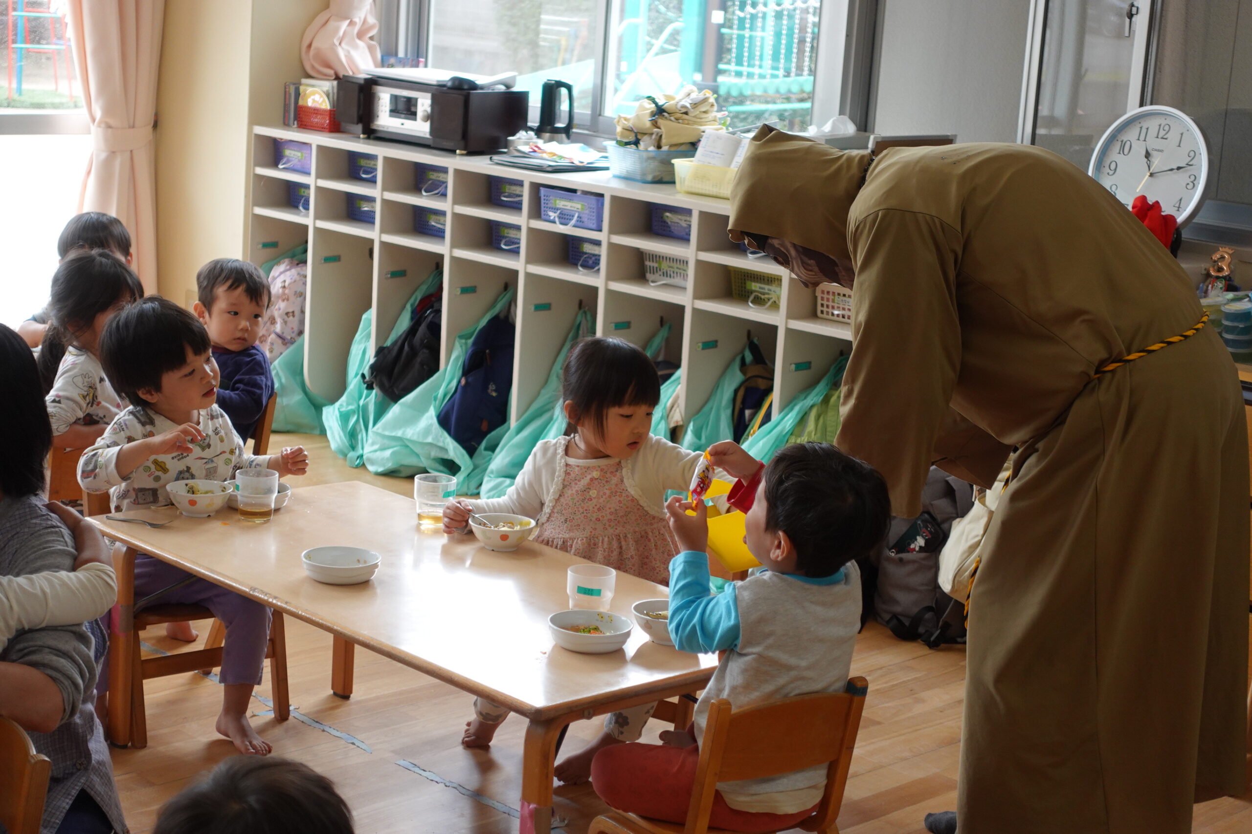 ハロウィンの英語では、ピーター先生が毎年恒例の仮装をして保育園に来てくれました。きりん組・ぞう組の英語が終わった後に、各クラスを回りお菓子をプレゼントしてくれました。子ども達はドキドキ!お菓子をもらってニッコリでしたよ。