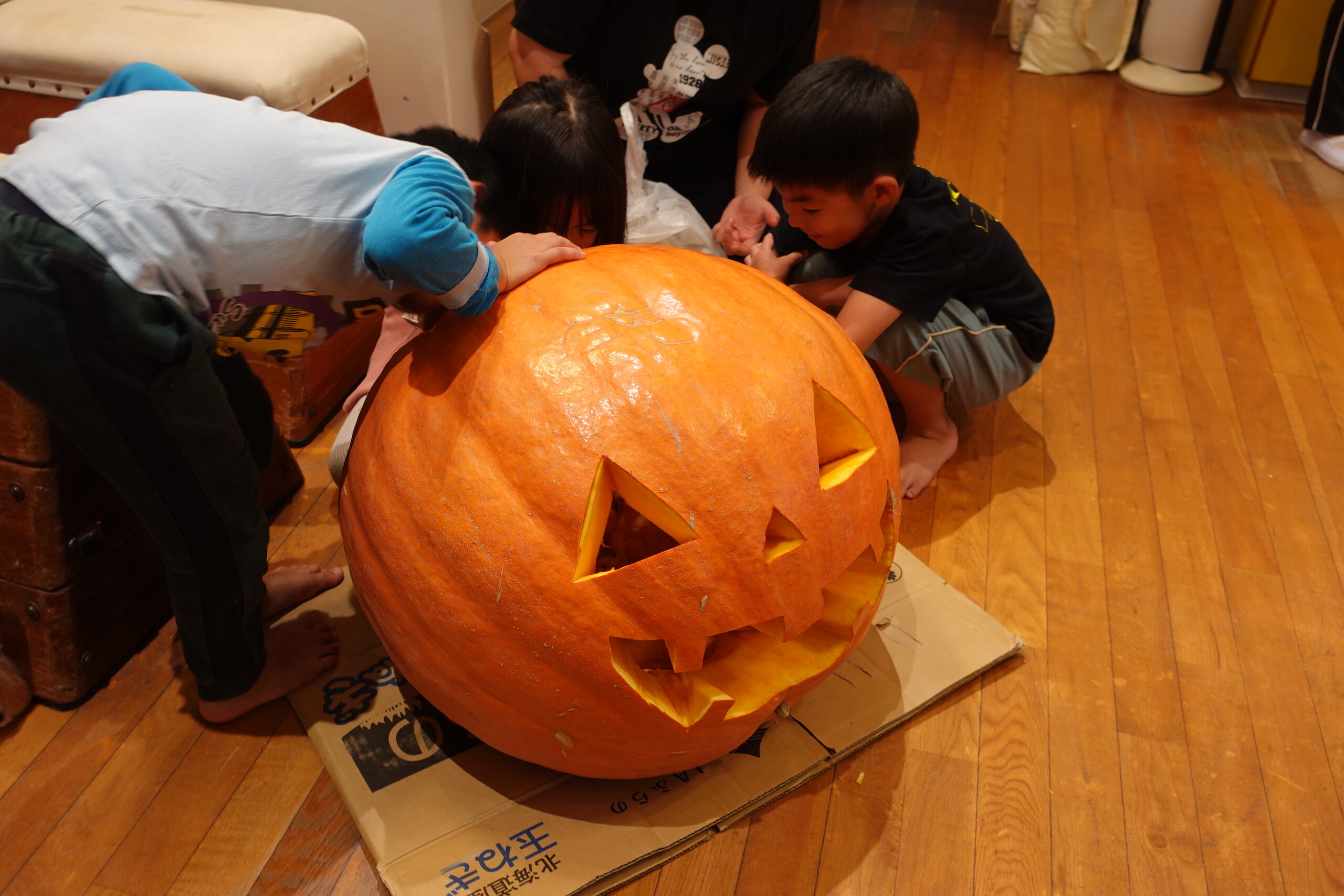 毎年恒例になっている、ハロウィンのかぼちゃをぞう組さんのお友達が作ってくれました。48キロの大きなかぼちゃに子ども達はやる気満々!「よーし!掘るぞ!」と、スプーンを持って張り切って掘っていましたよ。みんなで力を合わせて完成することができて満足顔でした!色々なクラスのお友達も玄関に飾られているかぼちゃを見て興味津々でした。