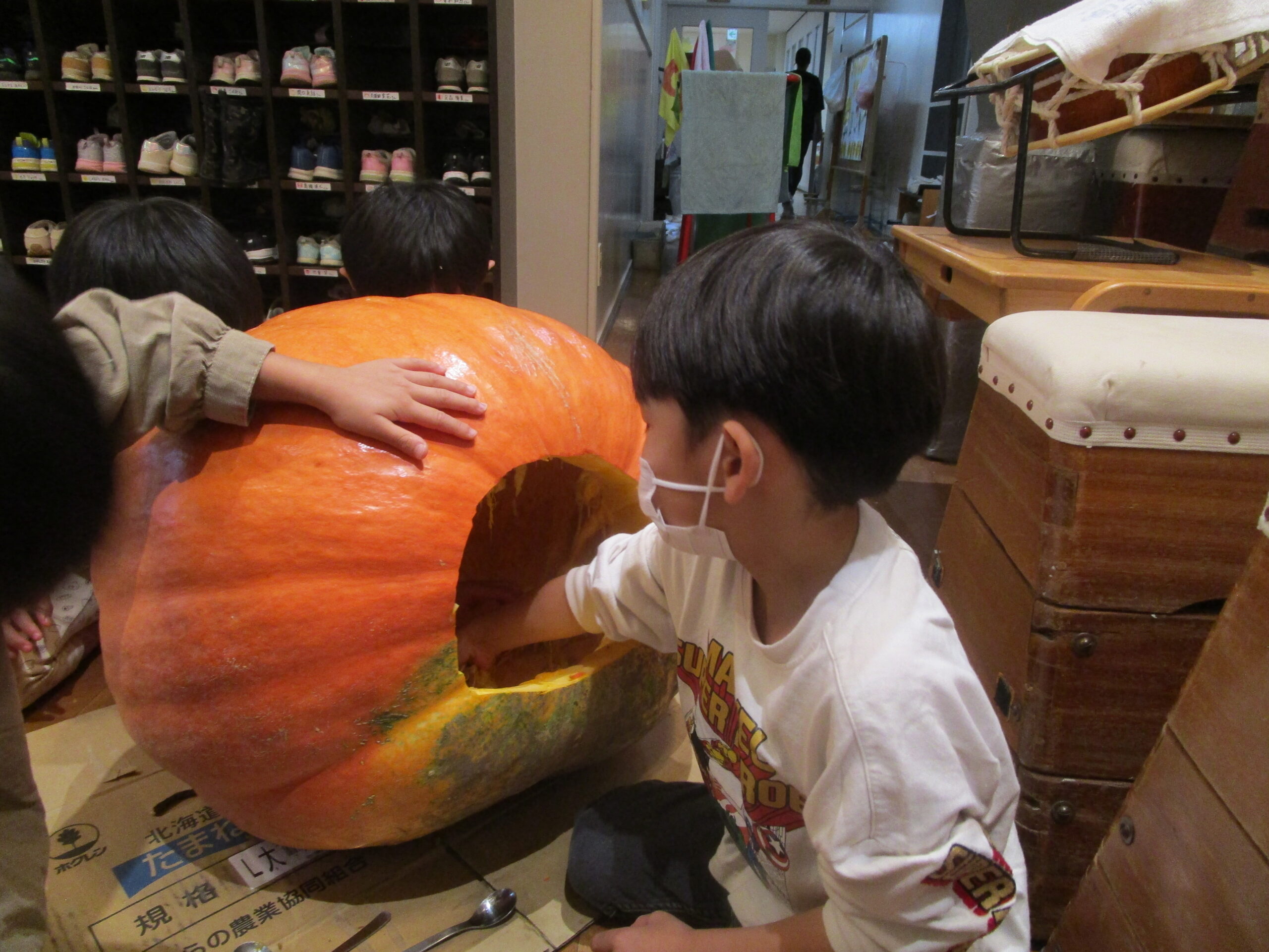 毎年恒例になっている、ハロウィンのかぼちゃをぞう組さんのお友達が作ってくれました。48キロの大きなかぼちゃに子ども達はやる気満々!「よーし!掘るぞ!」と、スプーンを持って張り切って掘っていましたよ。みんなで力を合わせて完成することができて満足顔でした!色々なクラスのお友達も玄関に飾られているかぼちゃを見て興味津々でした。