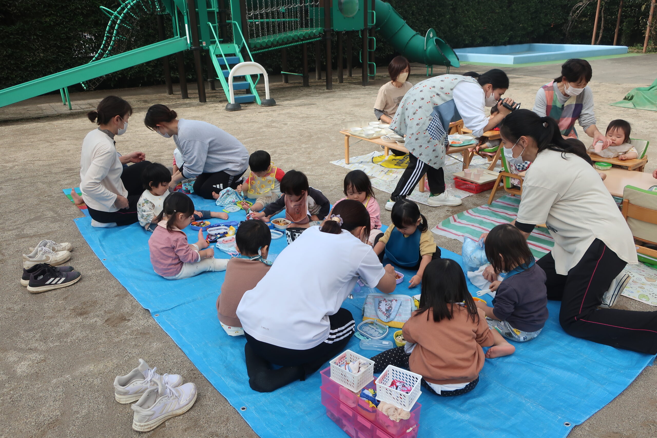 秋晴れの気持ちよい日に、ひよこ組、小さいこぐま組のお友達は