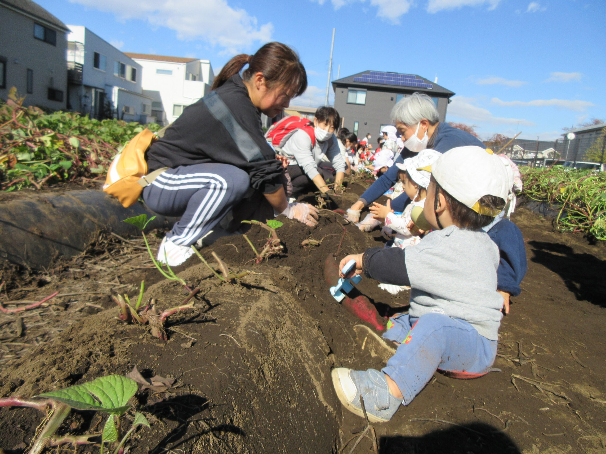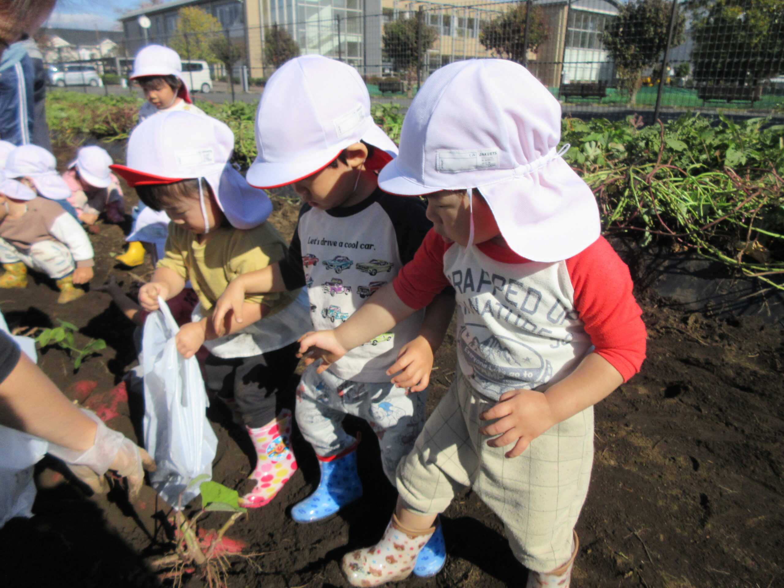 お散歩遠足をしました♪ まずは、大きいお友達と一緒にさつまいも掘りへ!