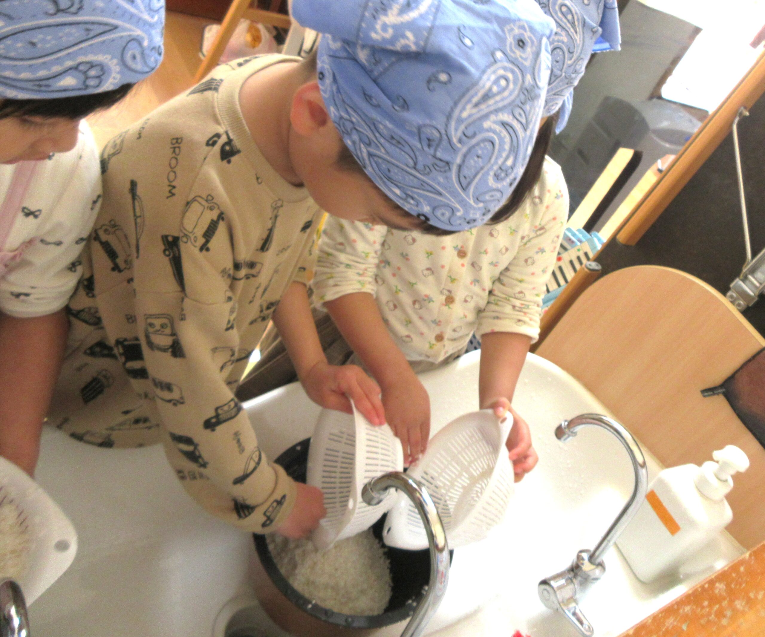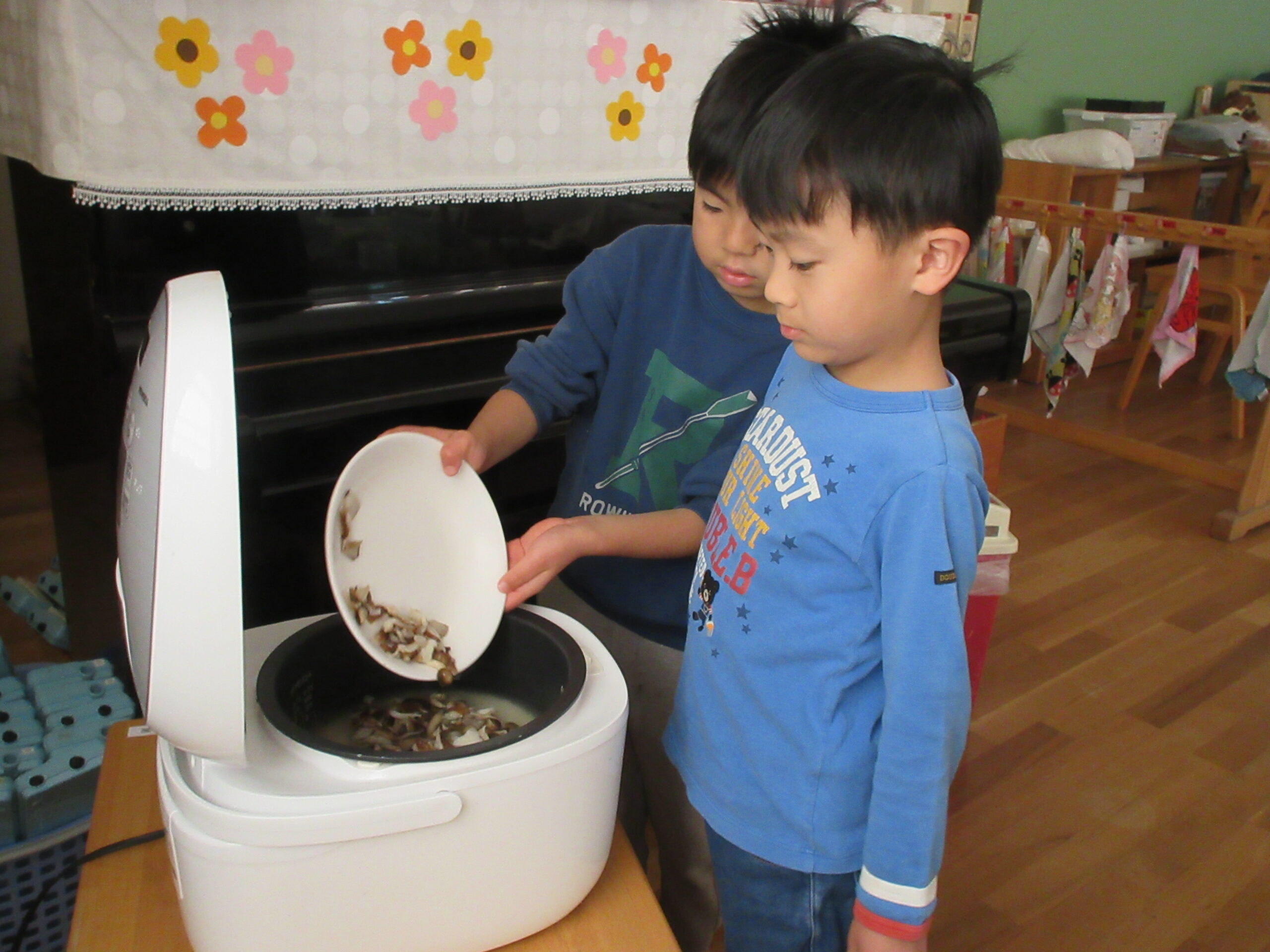 おやつの時間には、しめじの炊き込みご飯でおにぎりを作りました。紙コップにご飯を入れて、ラップをし、振ると…「丸くなってきた!」と嬉しそうな声が聞こえてきました♪