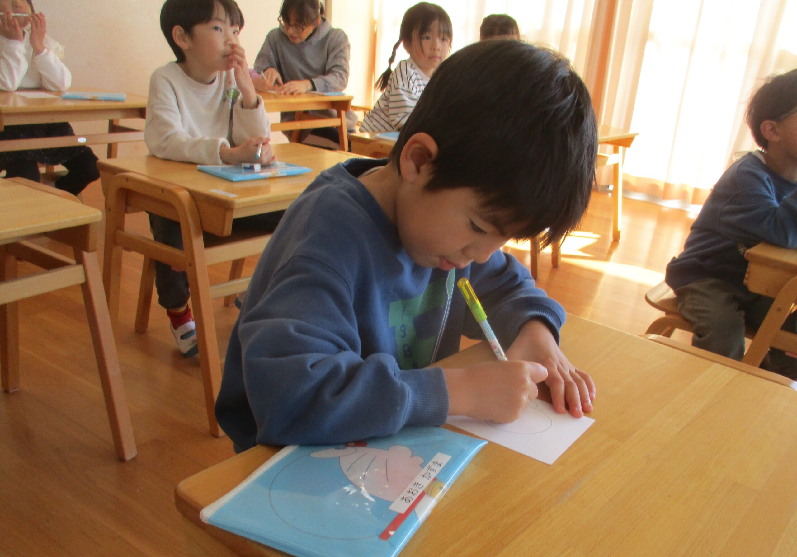 卒園児記念品として、作られる中の一つで版画作りに取り組みました。自分の顔を描いてハサミで切り、ボンドで貼るという一連の作業に皆が集中して取り組み、細かい顔の一つ一つも丁寧に作っています。