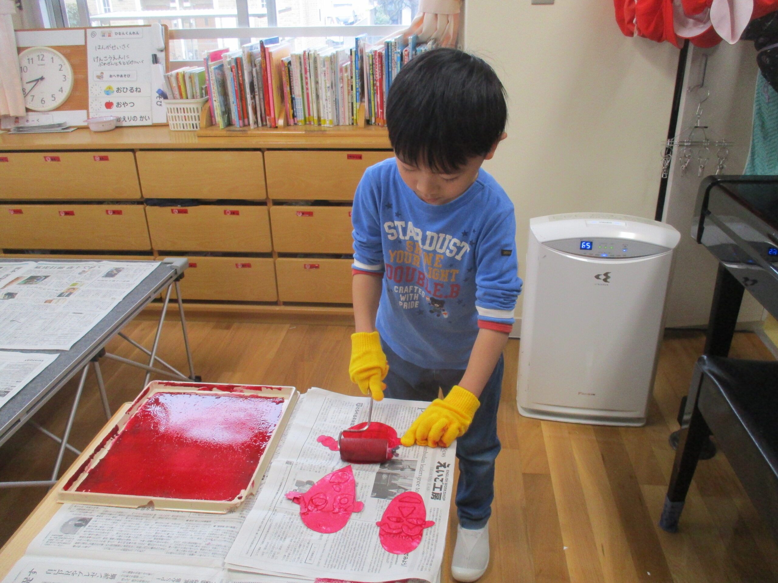 実際に版画を刷る日も、少し緊張気味でしたが「綺麗に色が出たよ!」と楽しみながら丁寧に刷っていて 出来上がりは、1人ひとりにそっくりな版画ができました。