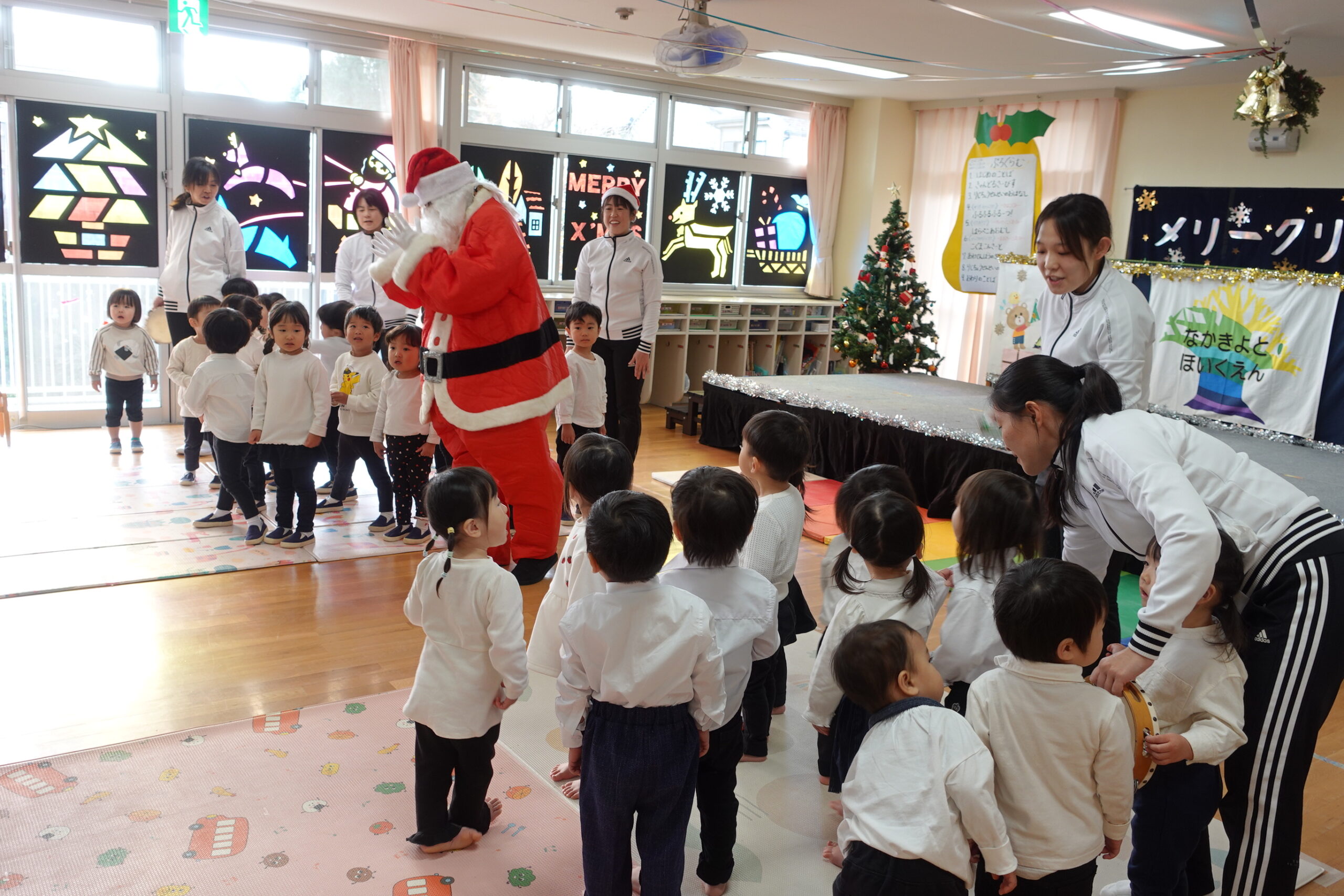 最後には、待ちに待ったサンタクロースが登場し「サンタさんだ!」と大喜び。プレゼントをもらい「ありがとう♪」と嬉しそうに伝える姿が見られました。こども達の笑顔溢れる温かなクリスマス会となりました。