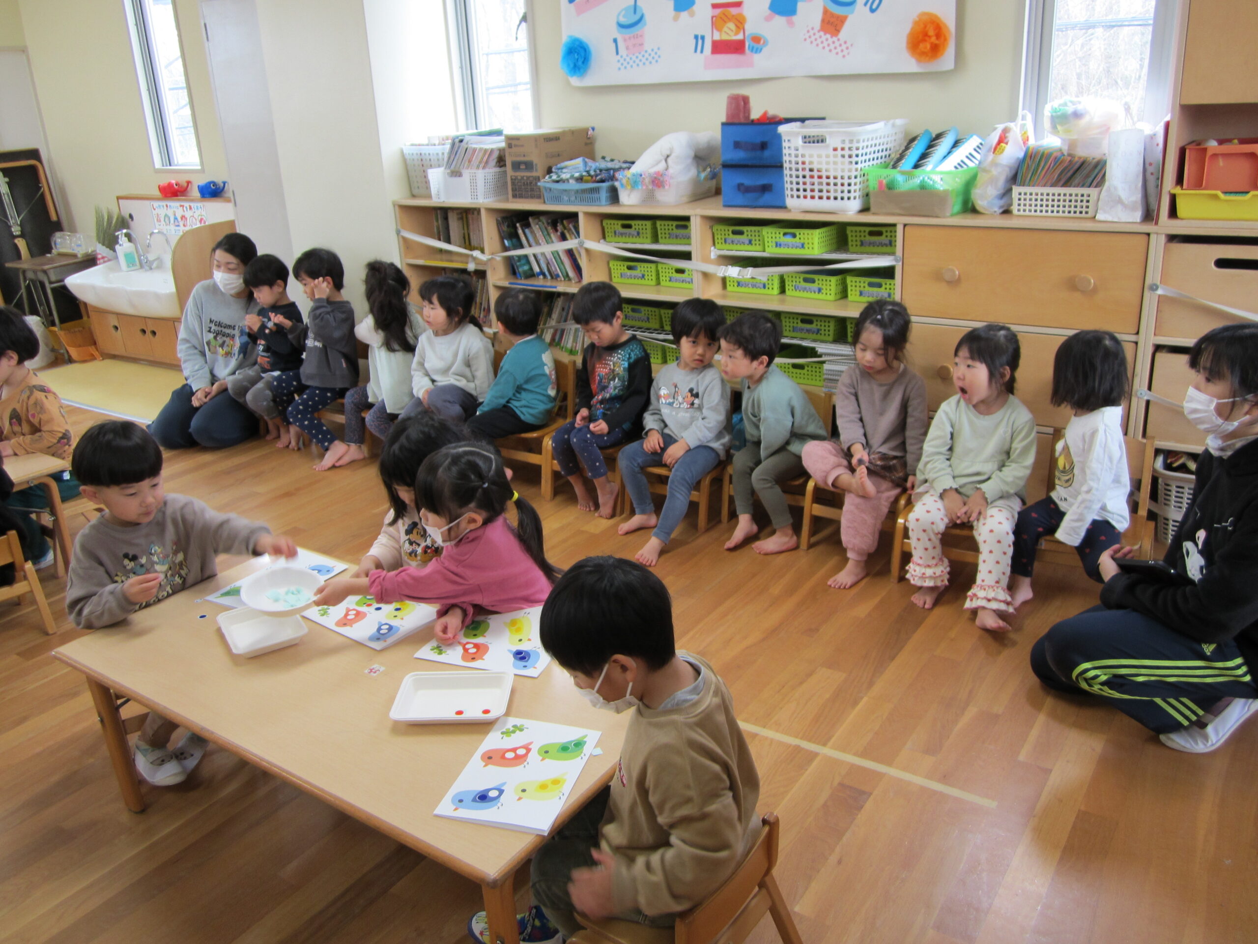 3歳児クラスのチャイルドステップの様子を2歳児クラスが見学。講師の方のお話に一生懸命耳を傾けながら、お兄ちゃんとお姉ちゃんの様子を見ていました。4月から幼児クラスになる準備はバッチリです!