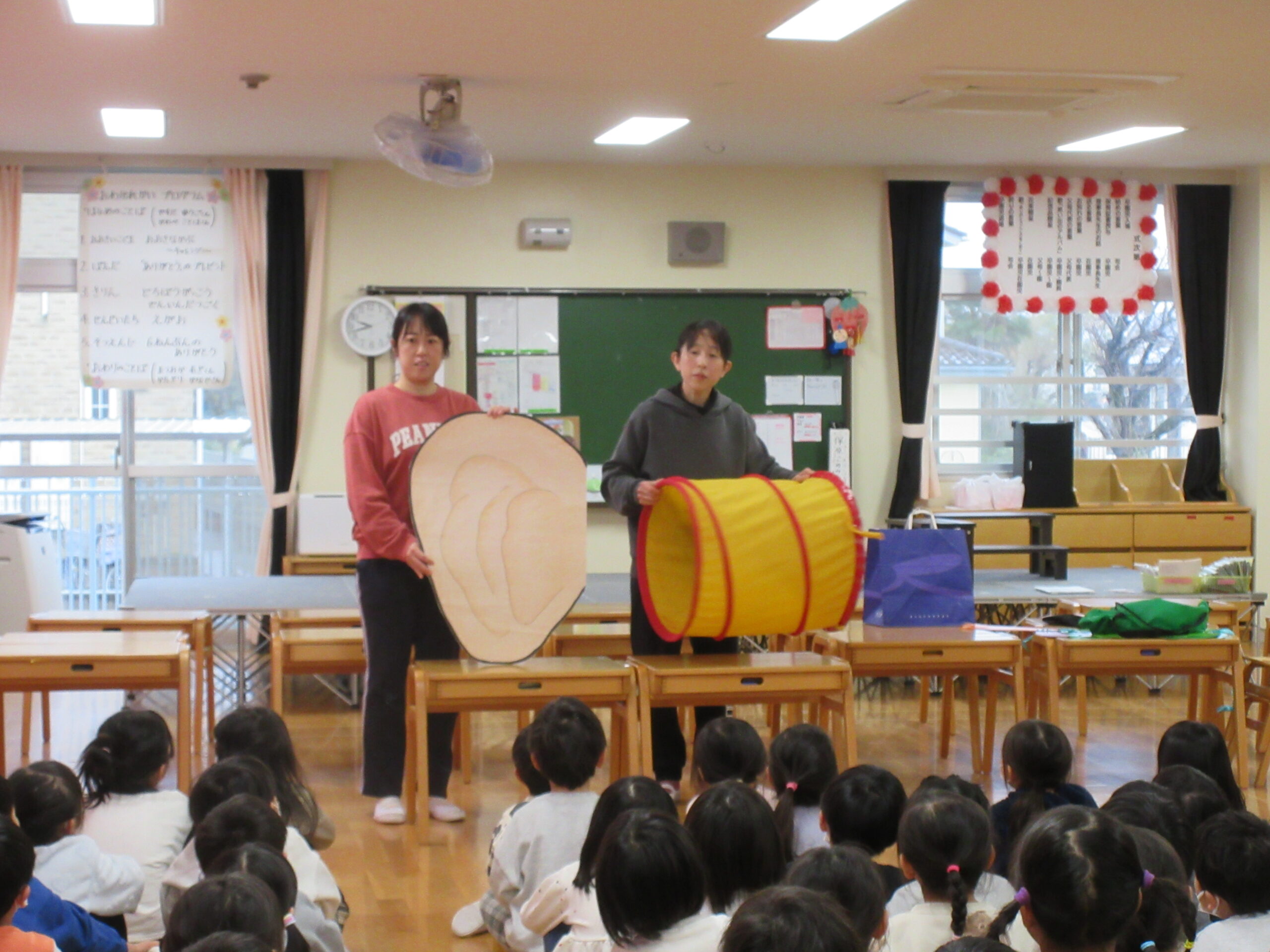 耳の日では看護師から耳について大切なお話しがありました。よく話しを聞いていて、「耳は鼻と繋がってるんだね」「耳に物を入れたらいけないよね」「近くで大きな声も出したらだめだよね!」と、色々なお約束など知ることができました。